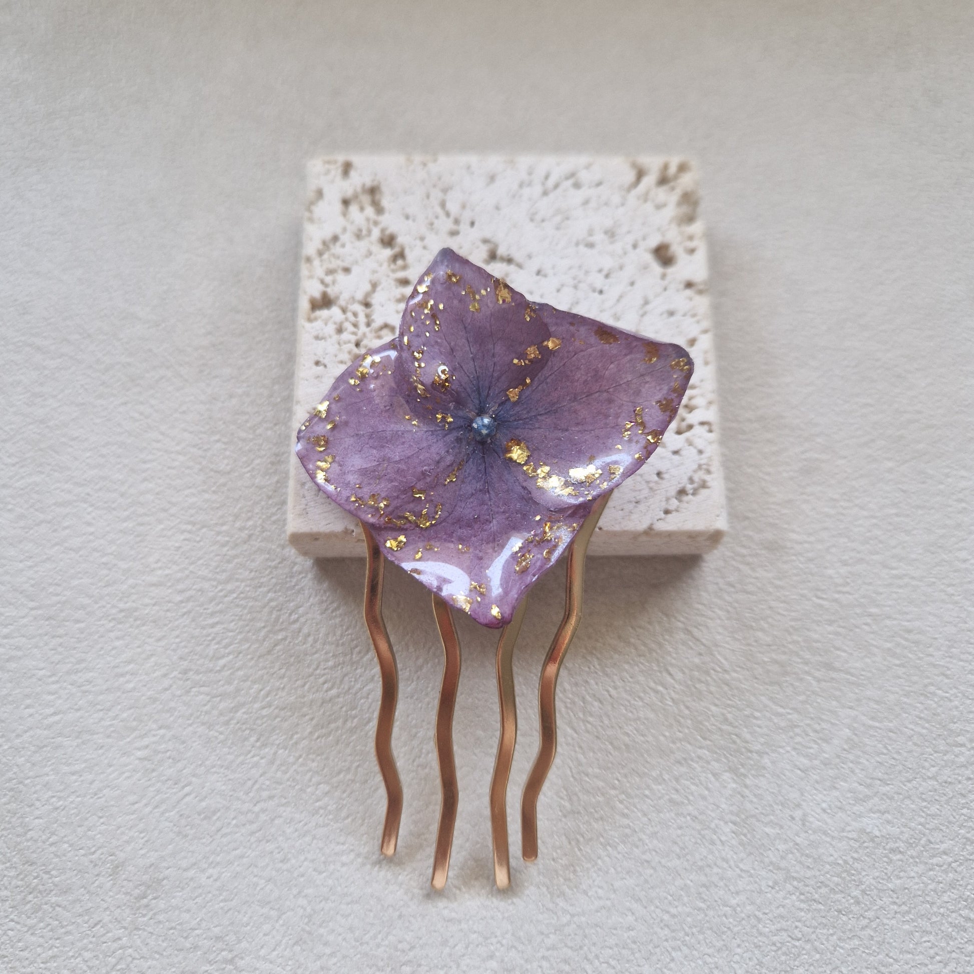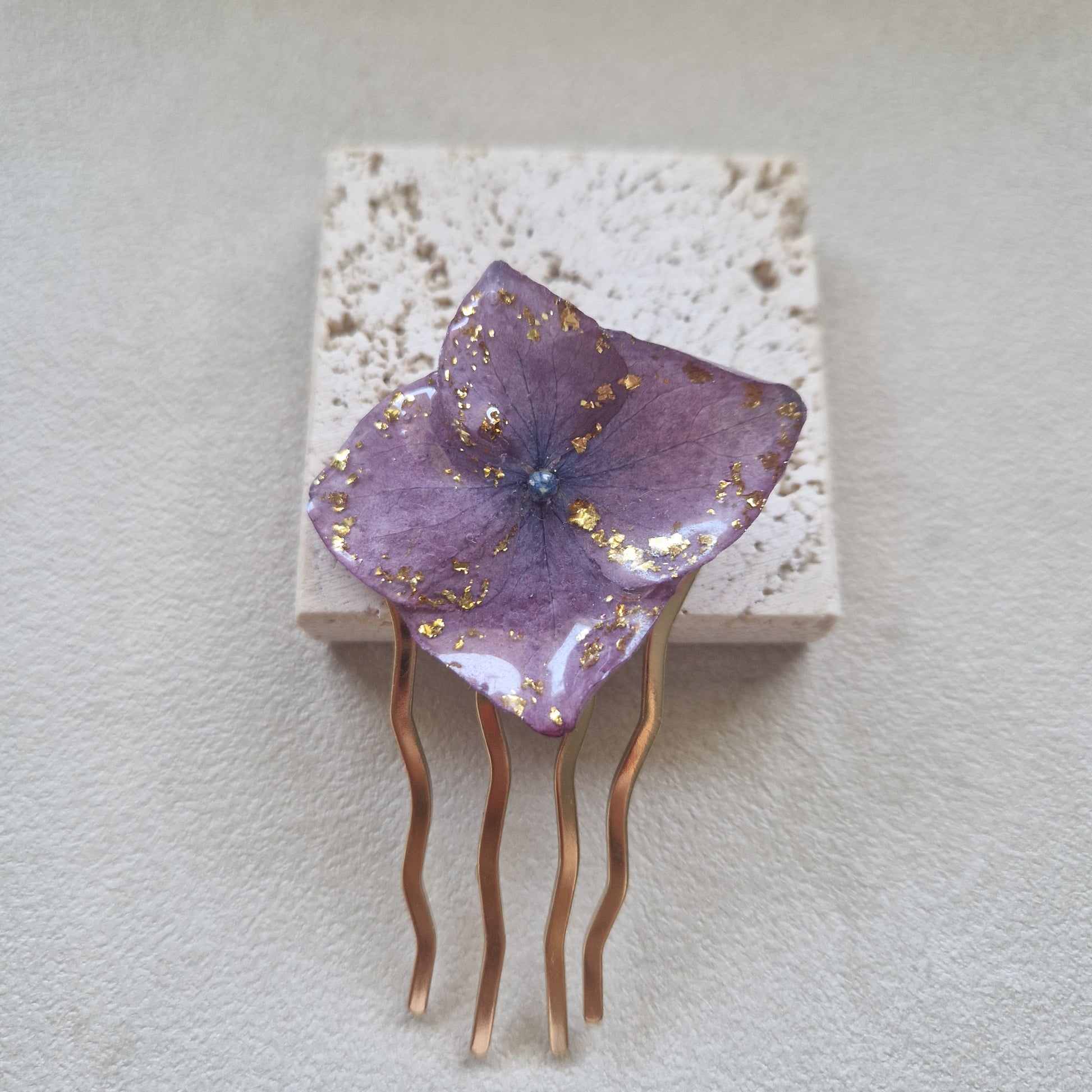 - Componente piesă: floare reală de hortensie mov, rășină, foiță aurie, bază aurie din aliaj de fier