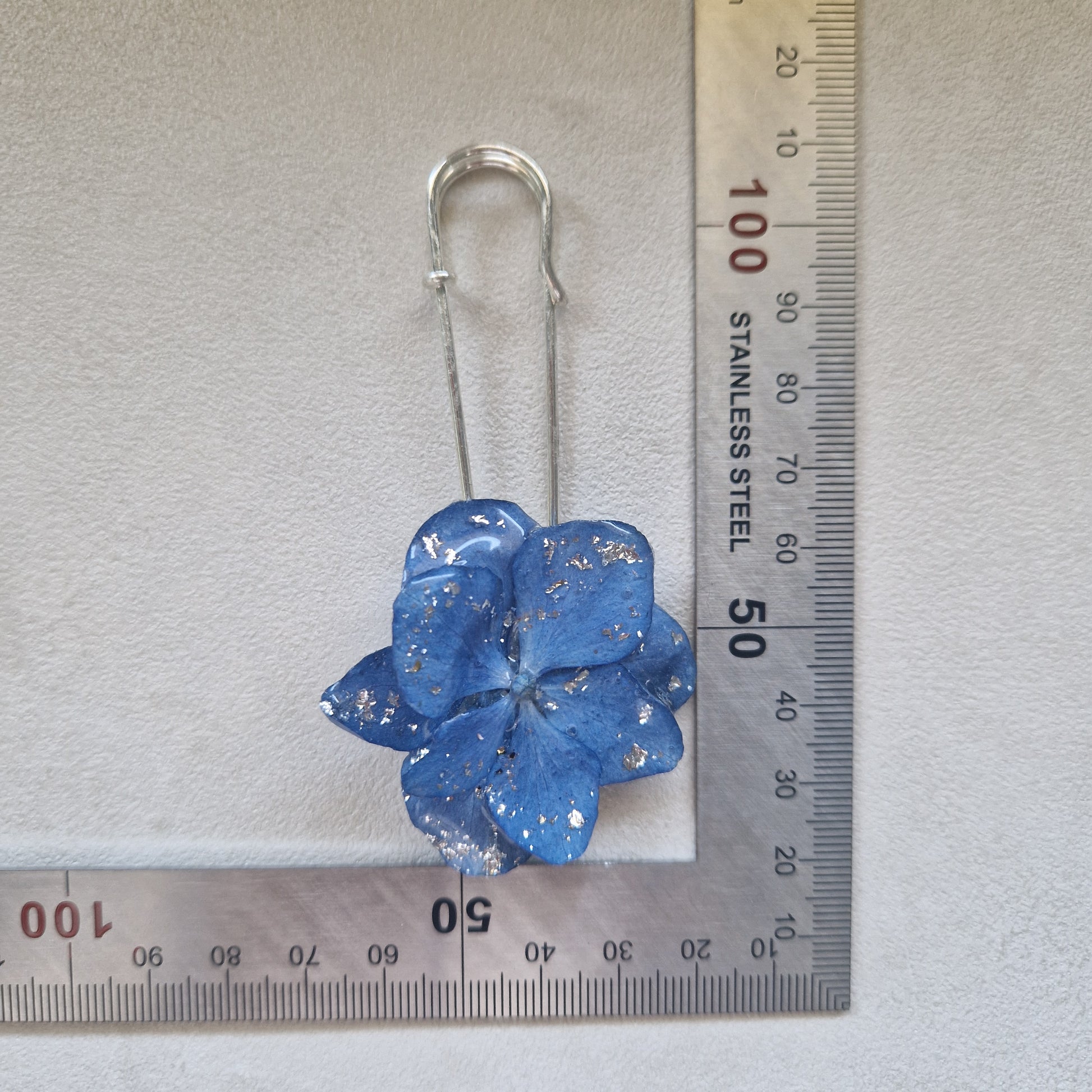- Componente piesă: floare naturală de hortensie albastră, foiță argintie, rășină, bază argintie din oțel inoxidabil