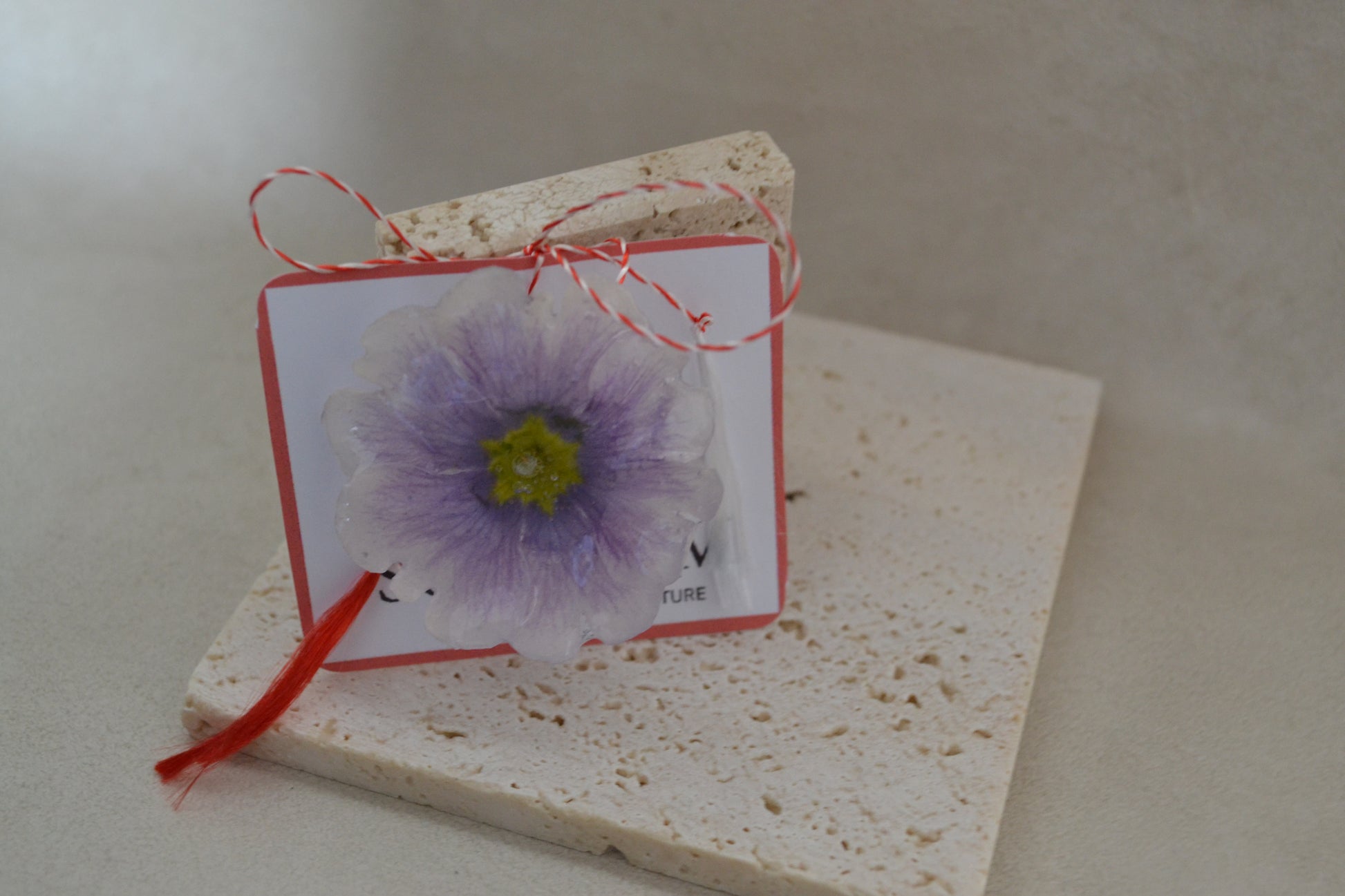 Este cadoul ideal pentru mărțișor. Floarea este primulă și este sigilată în rășină.