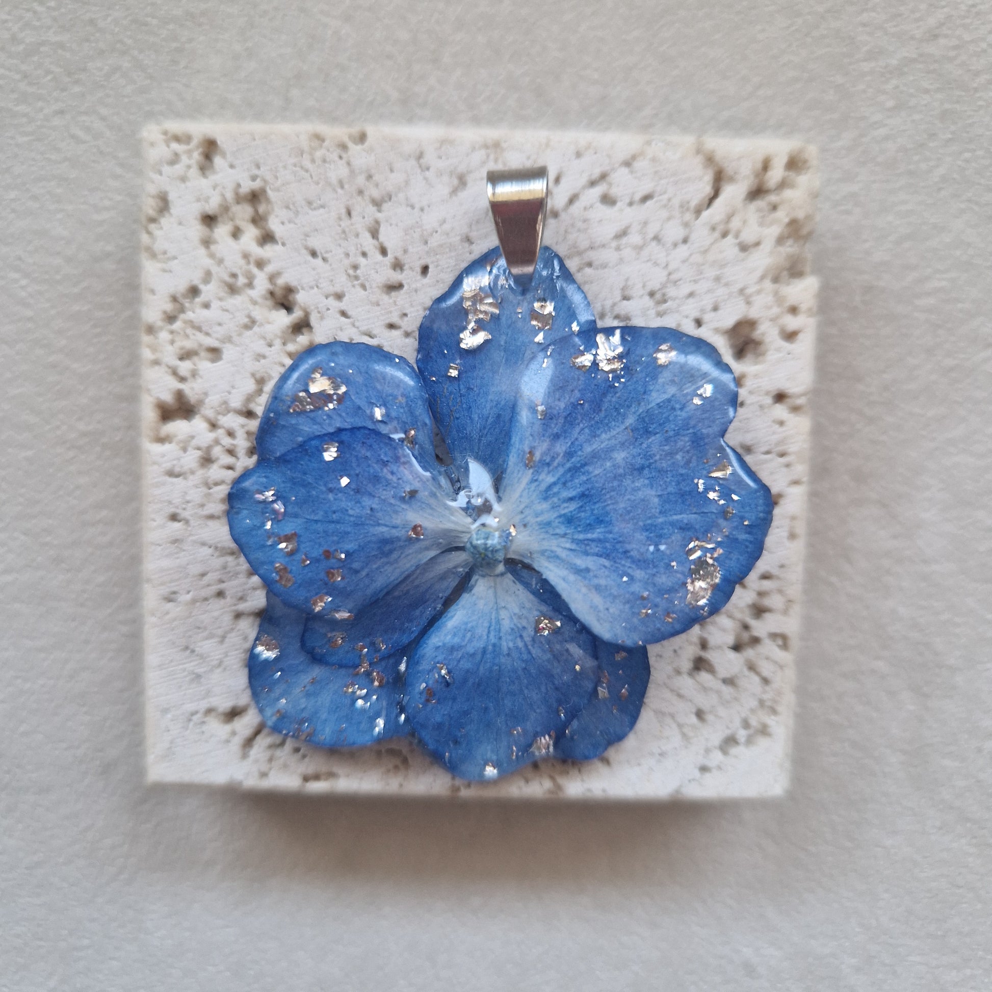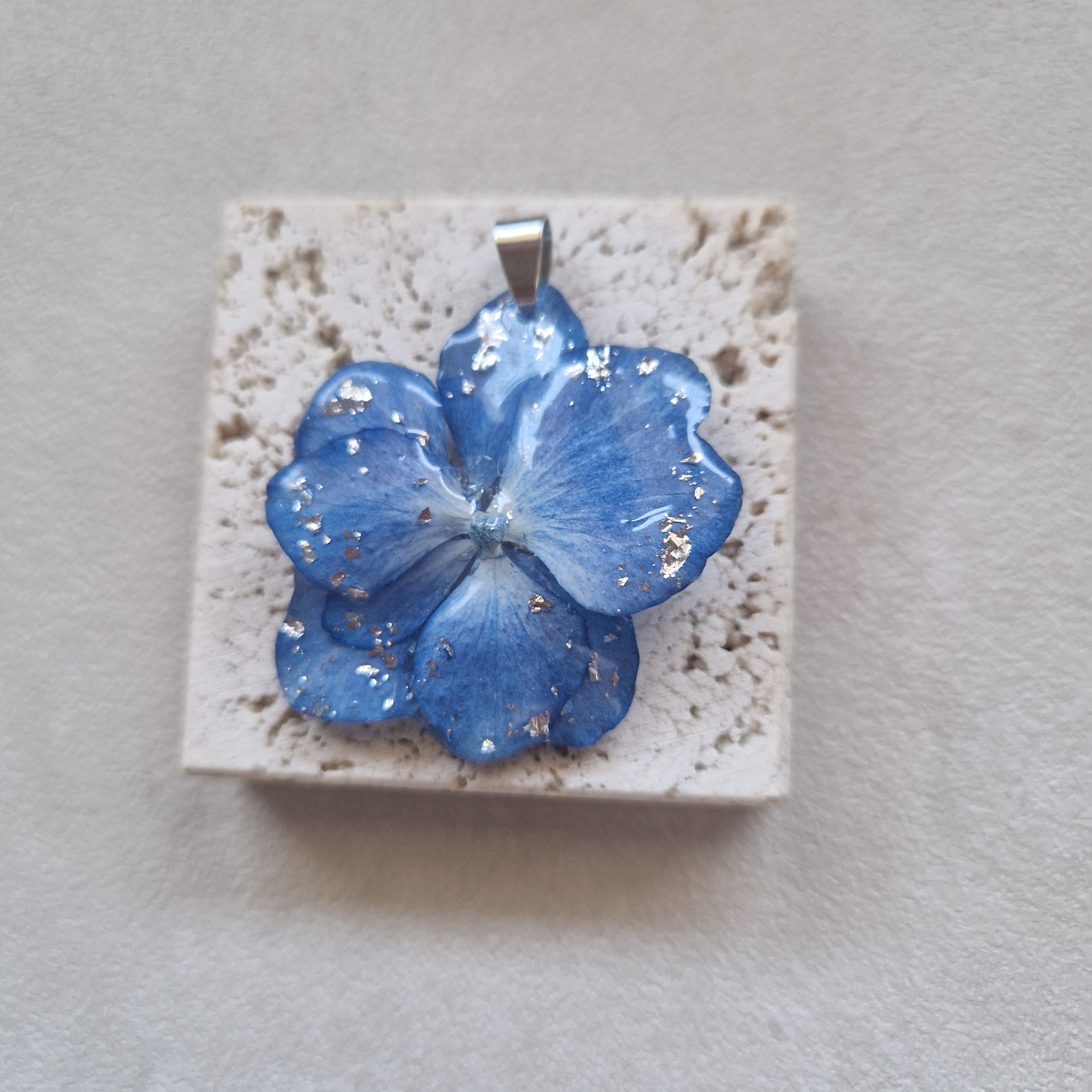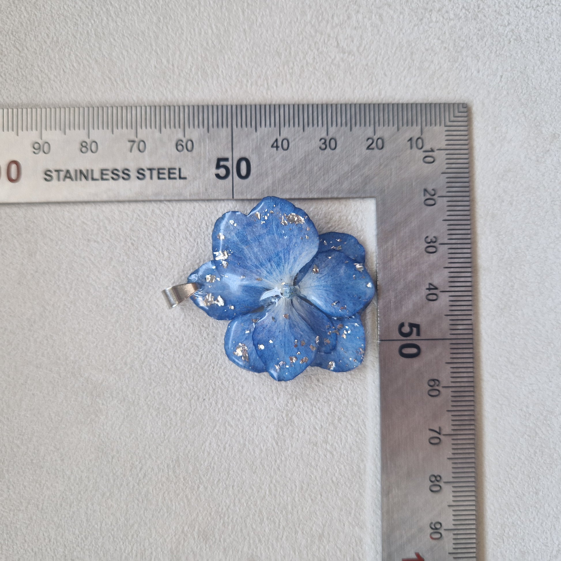 - Componente piesă: floare naturală hortensie albastră, foiță argintie, rășină, agățătoare argintie din oțel inoxidabil