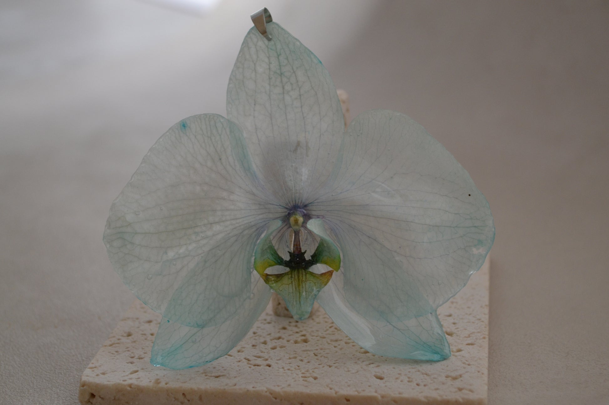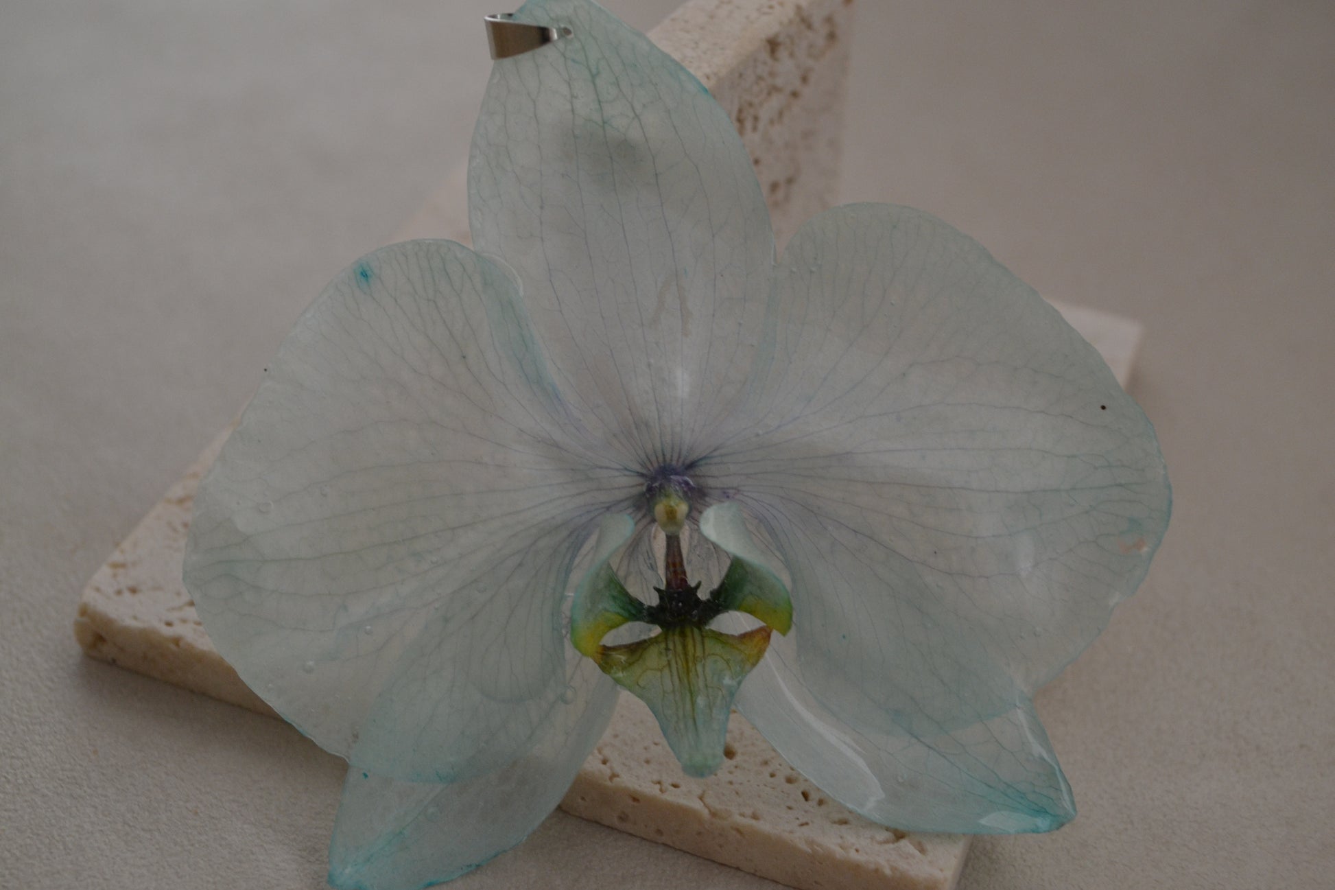- Componente piesă: orhidee naturală, rășină și pandantiv din oțel inoxidabil