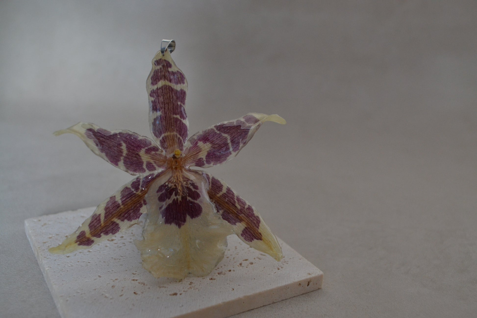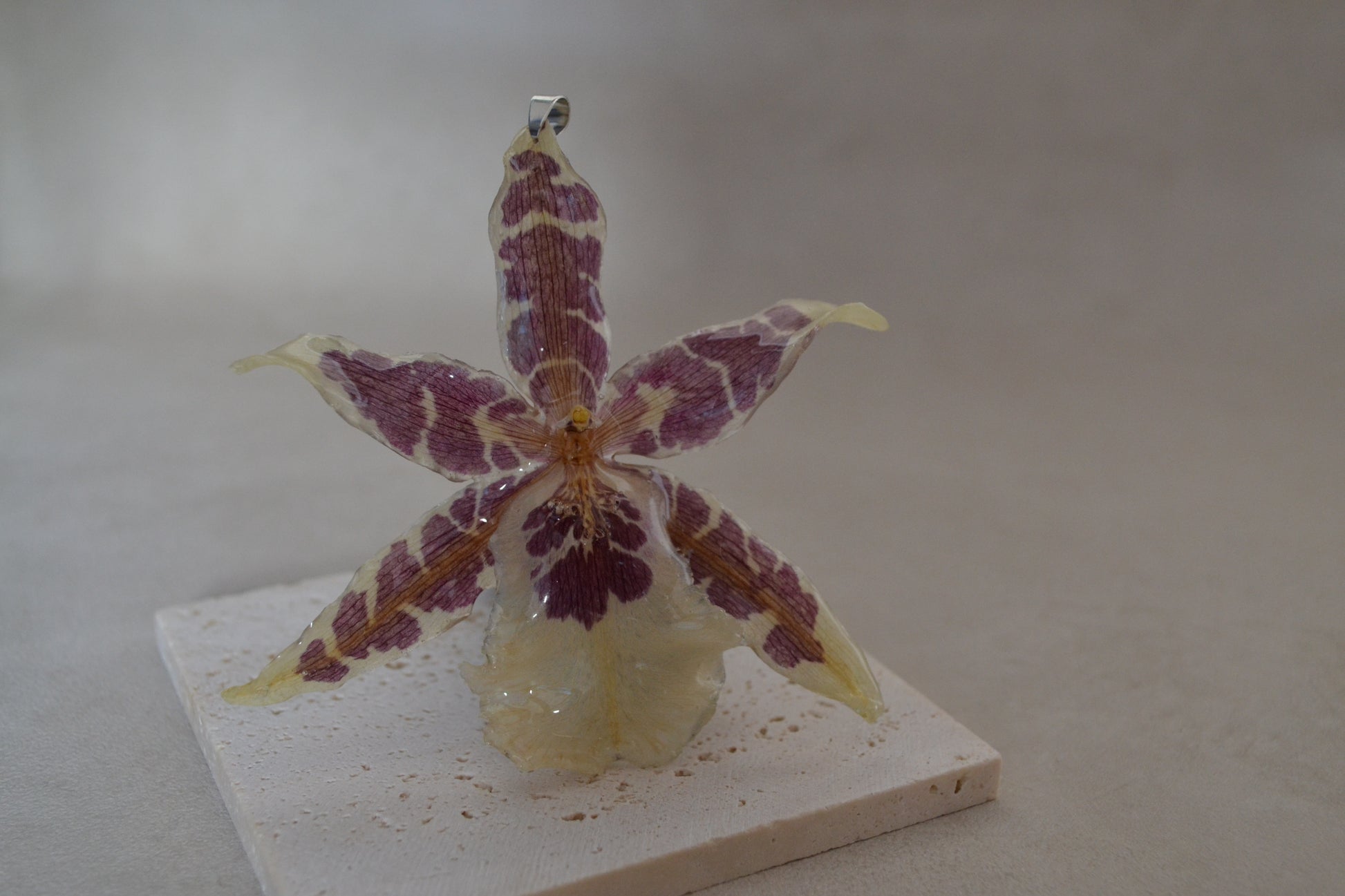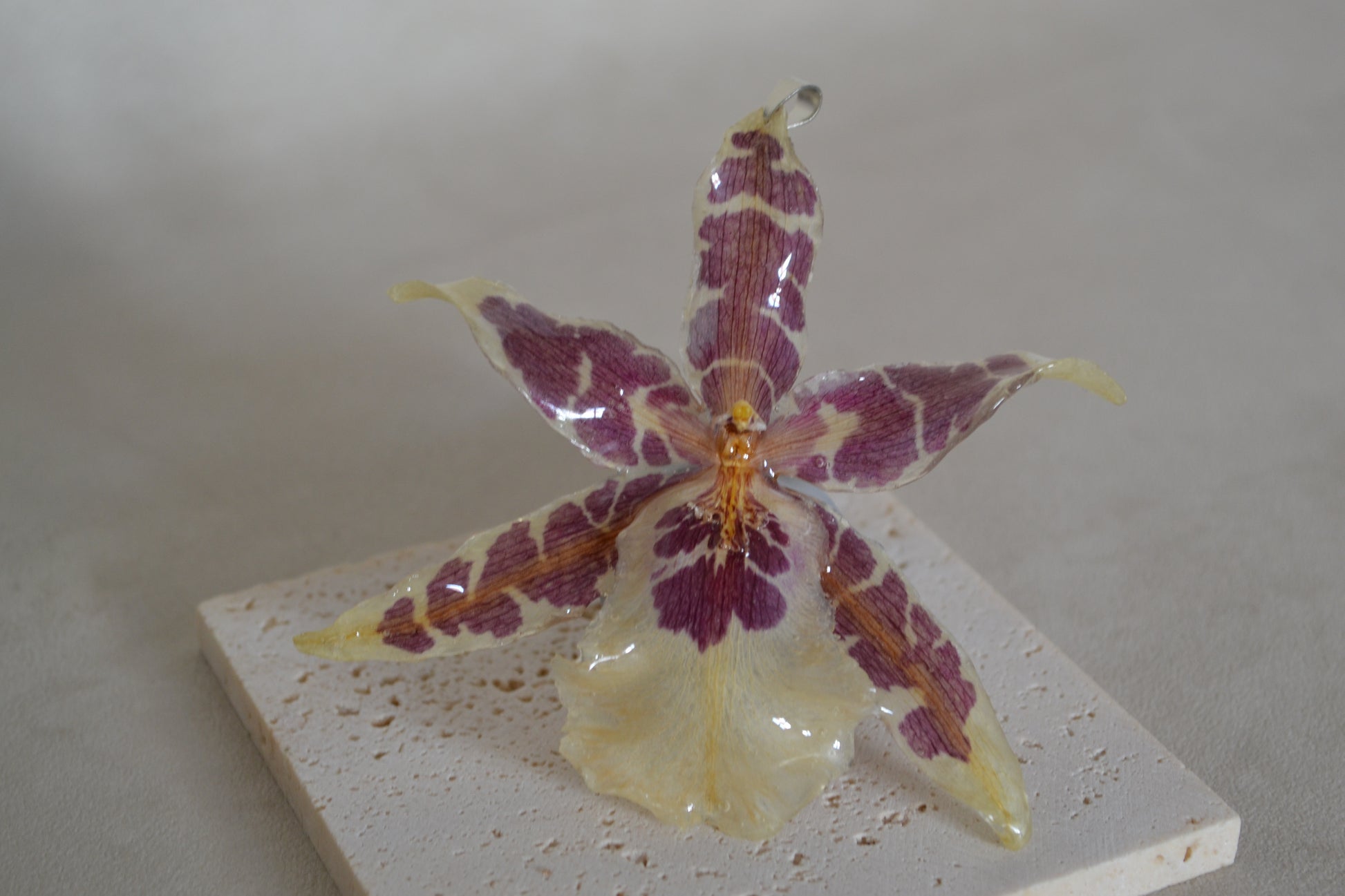 Bijuterie creată manual din orhidee naturlă, sigilată în rășină premium.