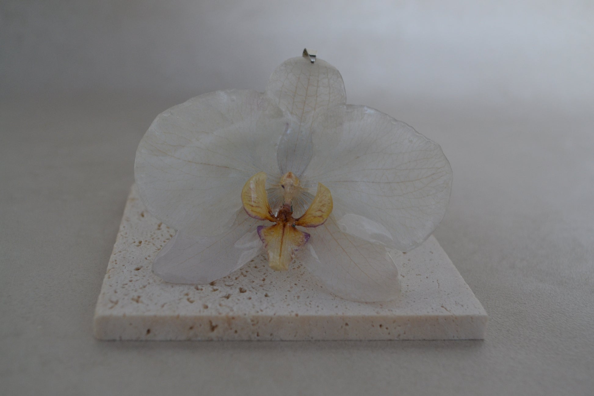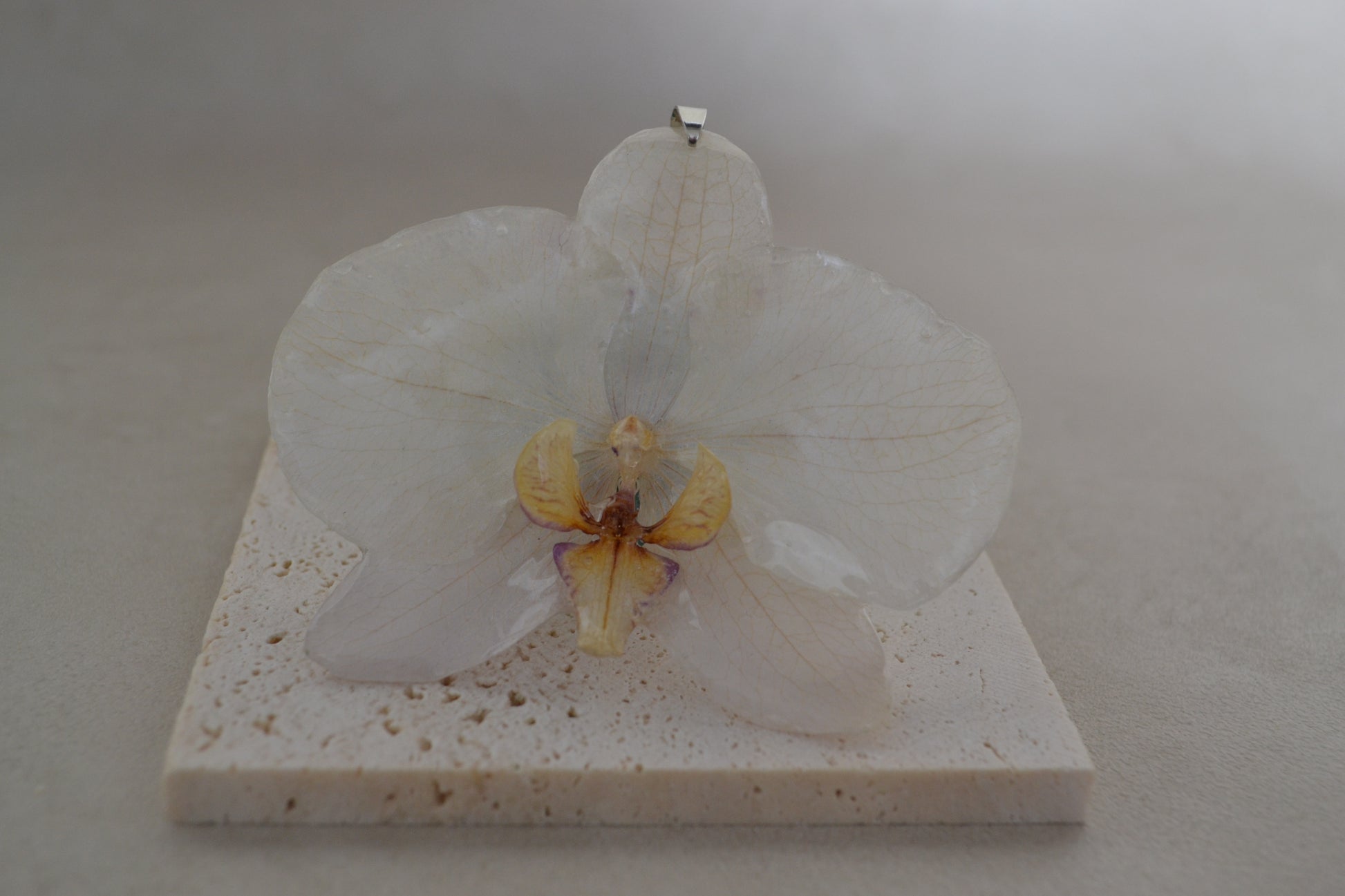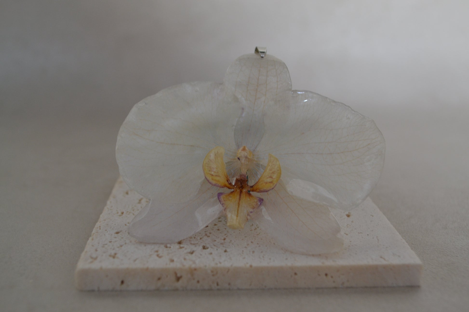 - Componente piesă: orhidee naturală, rășină și pandantiv din oțel inoxidabil.
