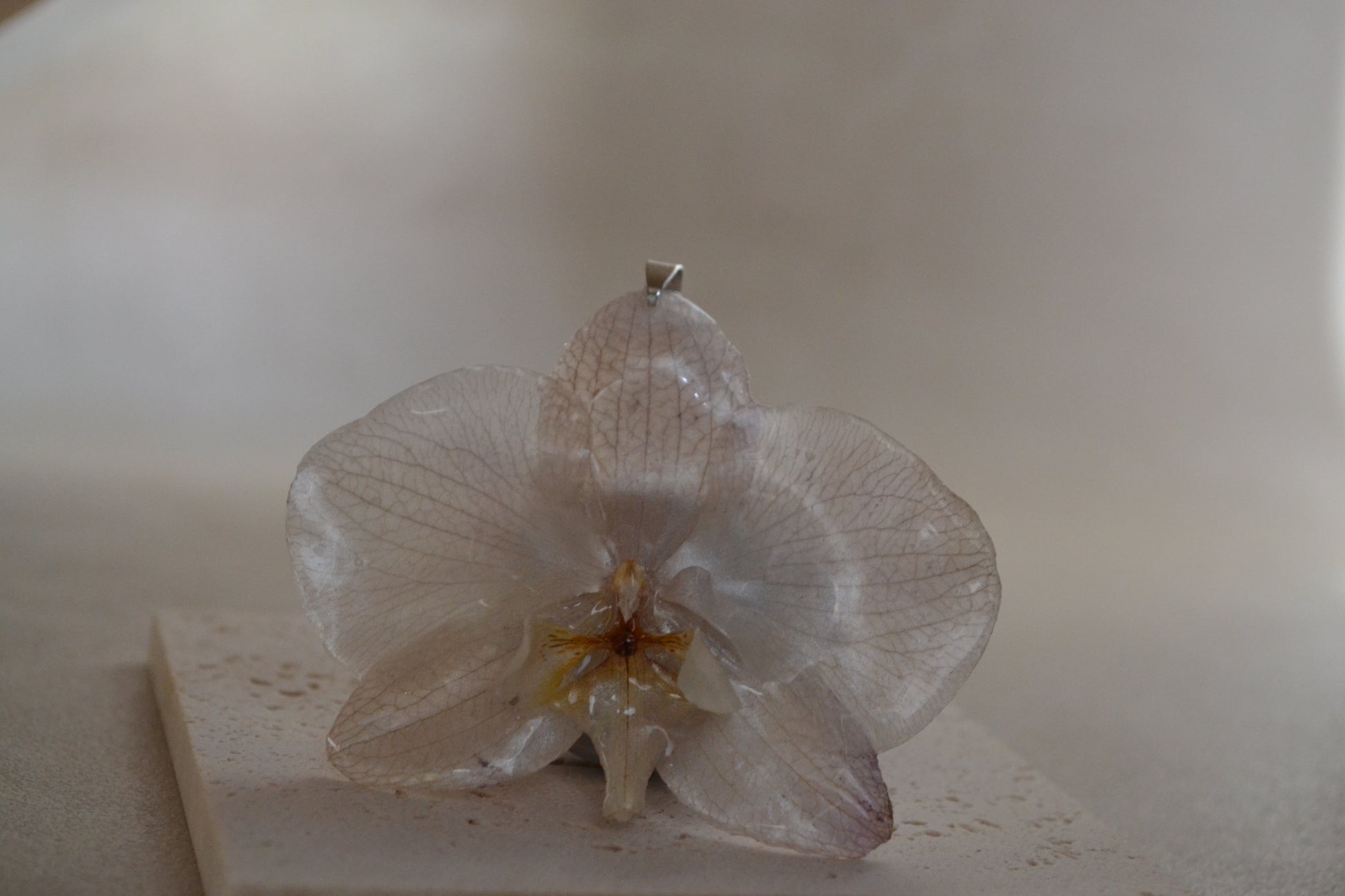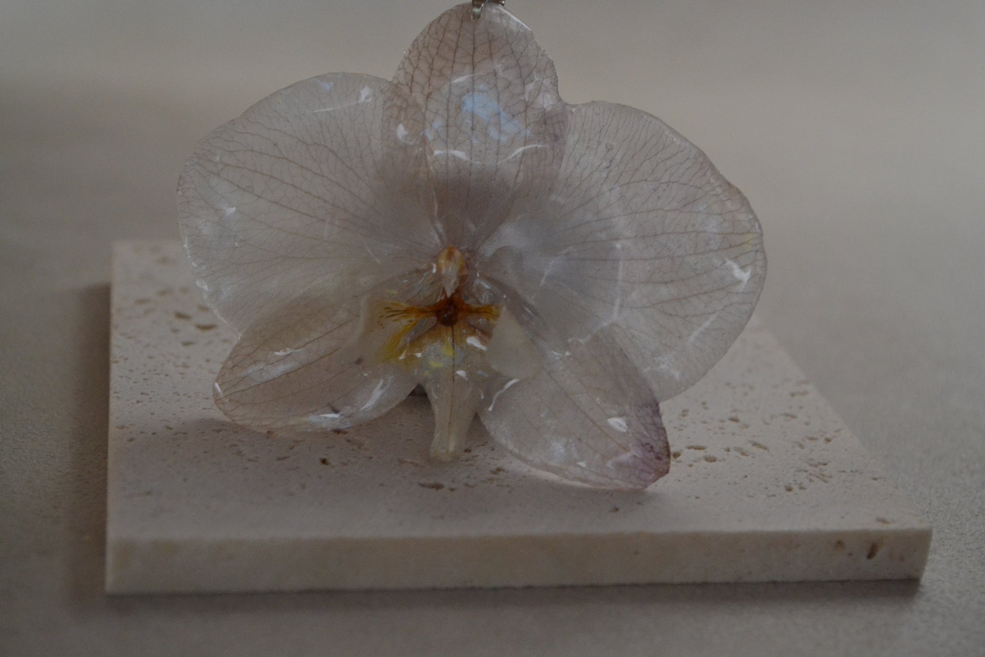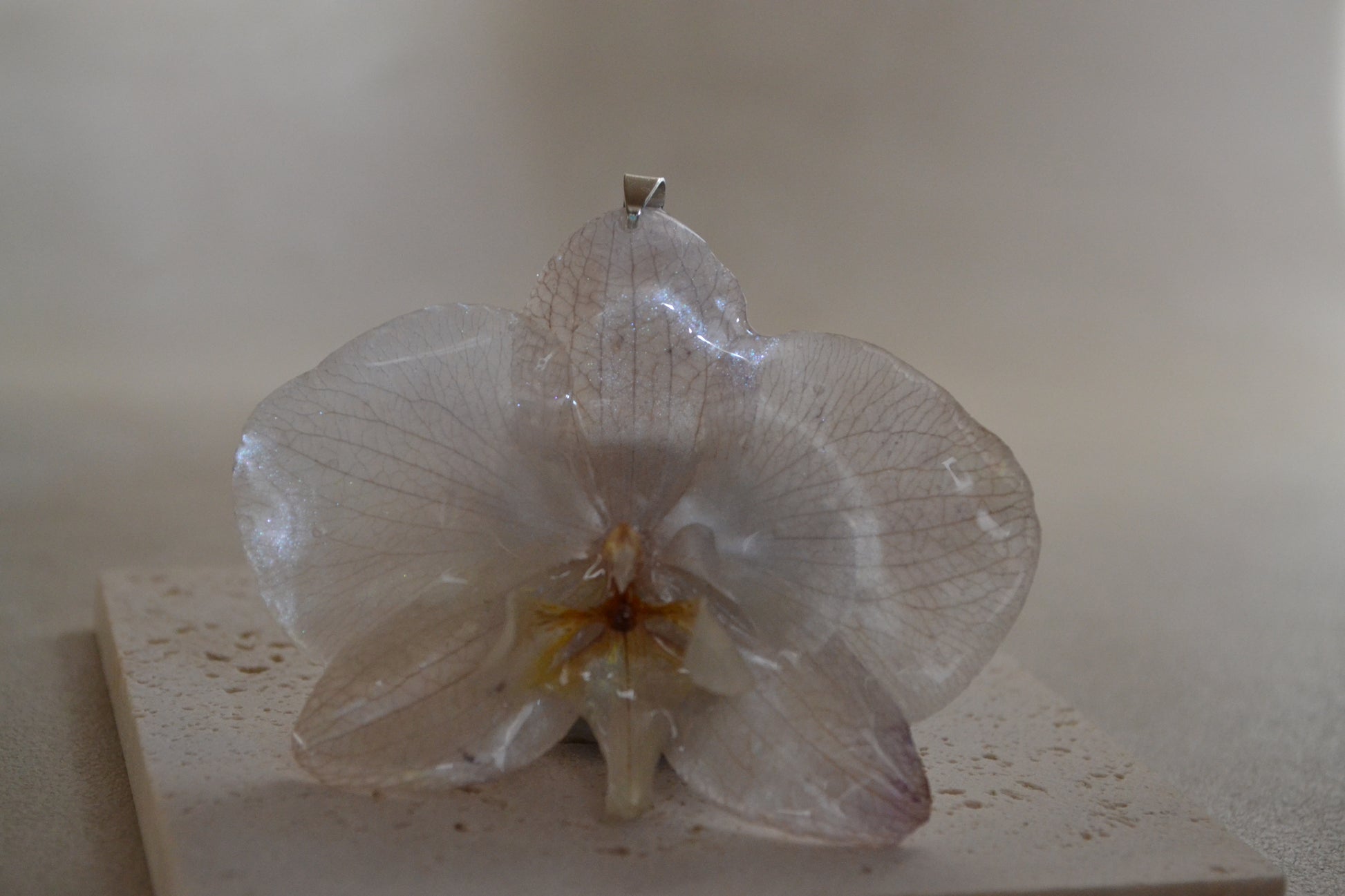 Bijuterie creată manual din floare de orhidee naturală, încapsulată în rășină premium. Creată pentru a aduce natura cât mai aproape de tine, acest pandantiv poartă frumusețea autentică a florilor.