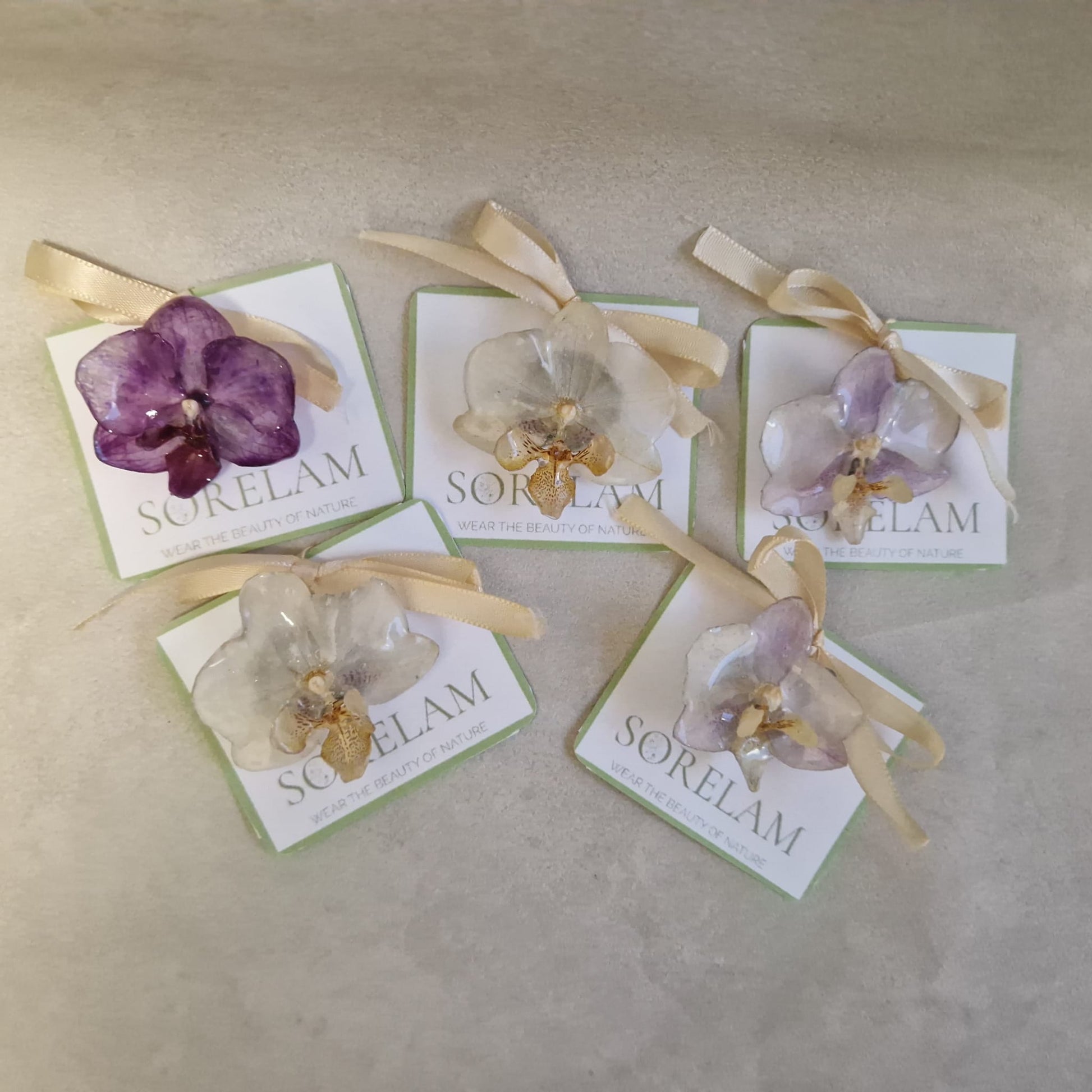 Set cinci brose cu flori naturale de orhidee.